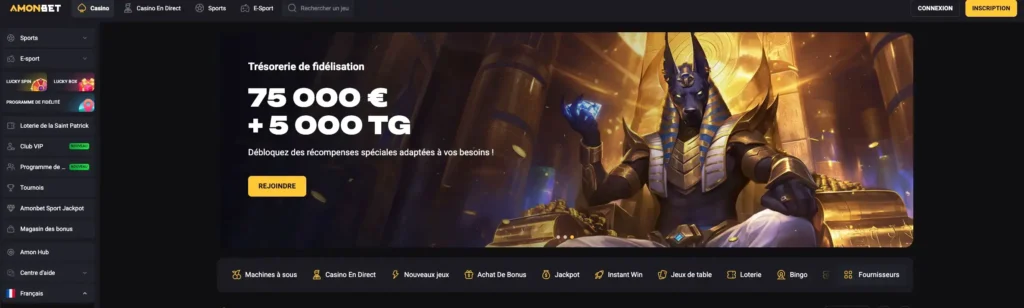AmonBet est un exemple typique de nouveau casino en ligne France, dont le principe repose sur l’équilibre entre le choix des bonus proposés et la convivialité de l’interface. Sur le site, les nouveaux venus peuvent bénéficier d’un pack de bienvenue de 100% jusqu’à 500€ + 100 tours gratuits avec une condition de mise de x35.